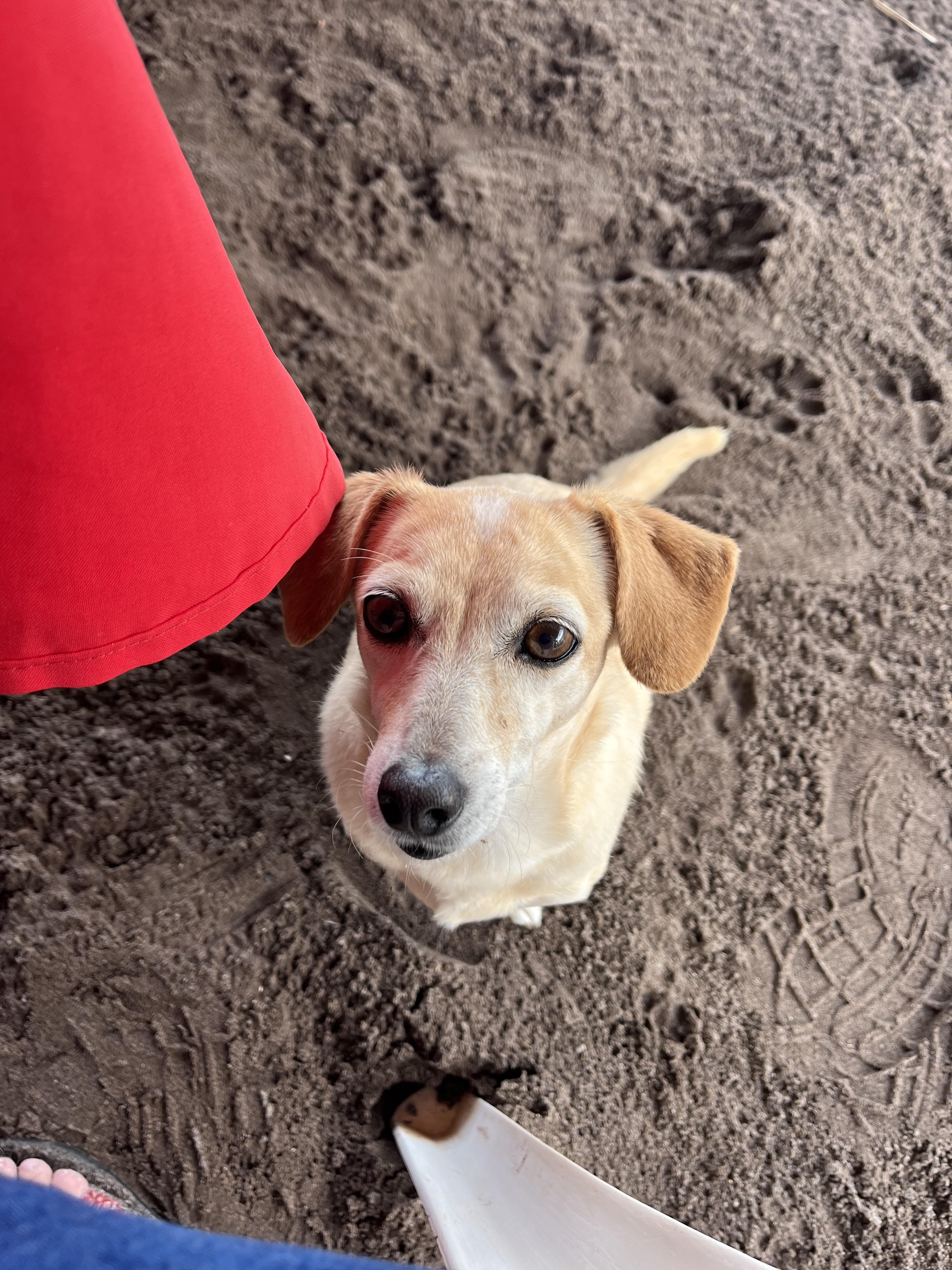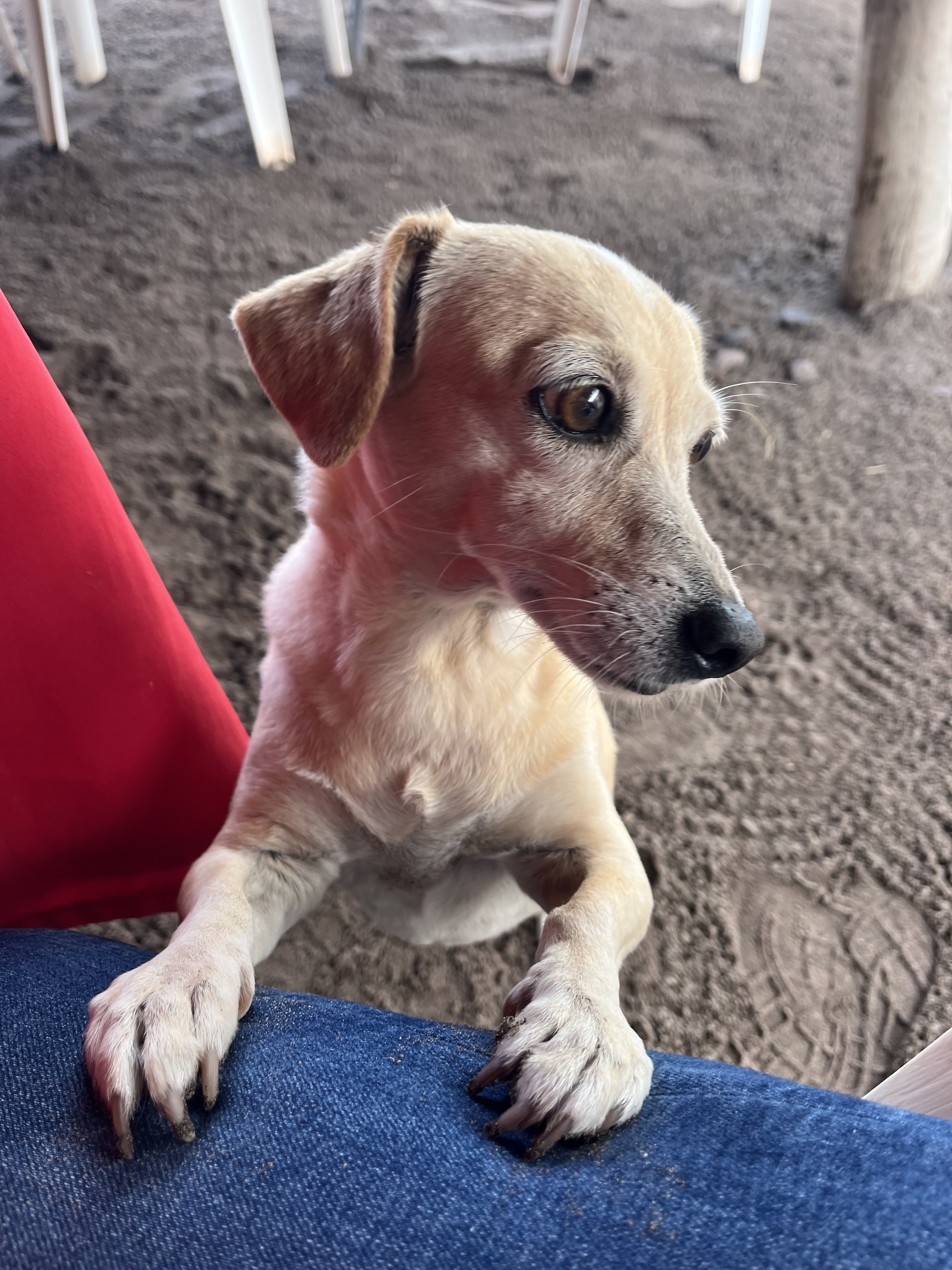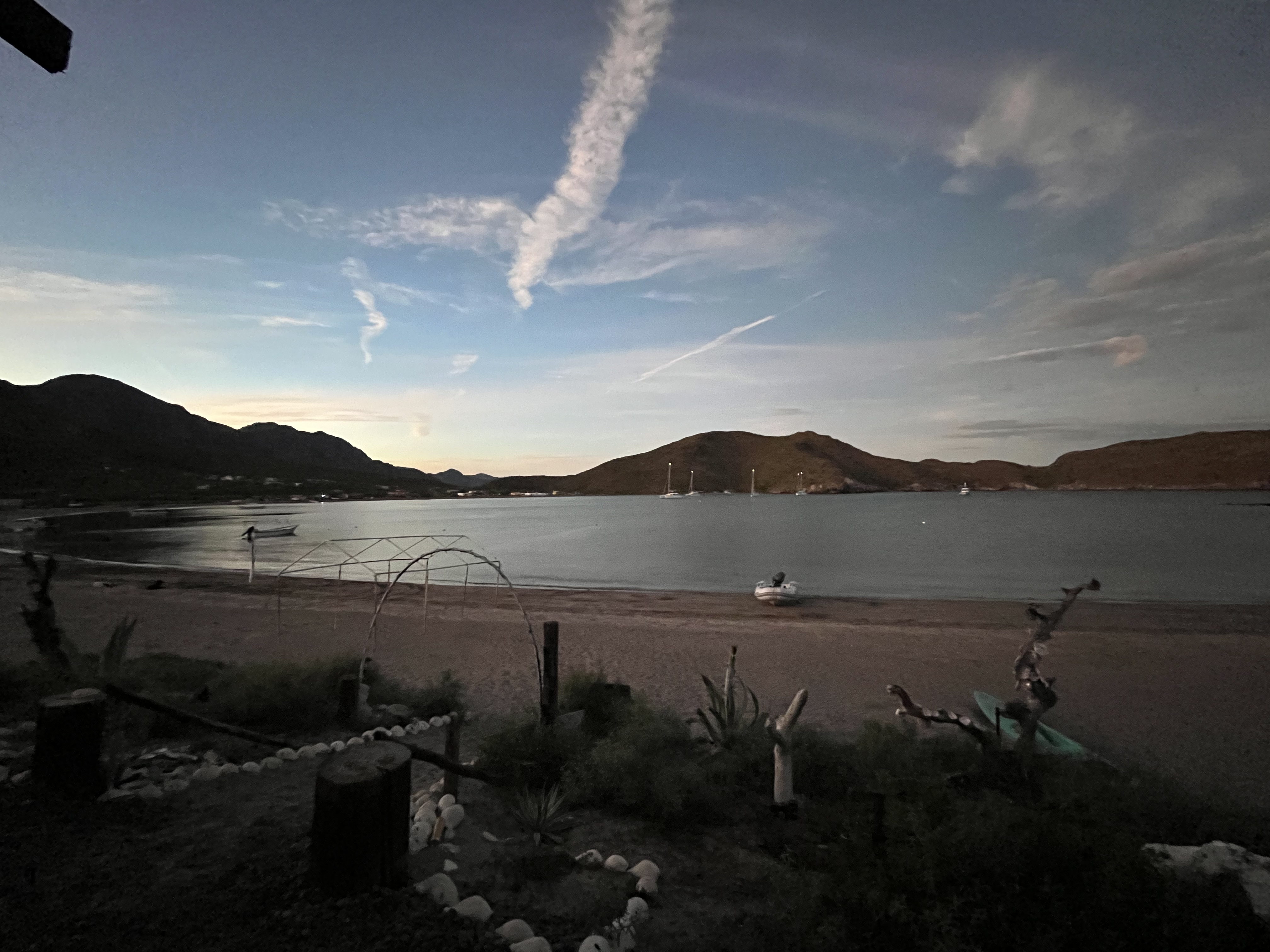 Back in Agua Verde, we went ashore for dinner our last night there. Melinda and Grace had been to the local beach restaurant for lunch before, and they loved the tacos. Grace also wanted to introduce me to the cute dog that befriended her during their first visit. As promised, the food was delicious and our feet were in the sand. The company was interesting as well – the tables being populated with other cruisers from the bay. We dined on fine tacos and listened to plans and reminiscenced as the sun set behind us.
