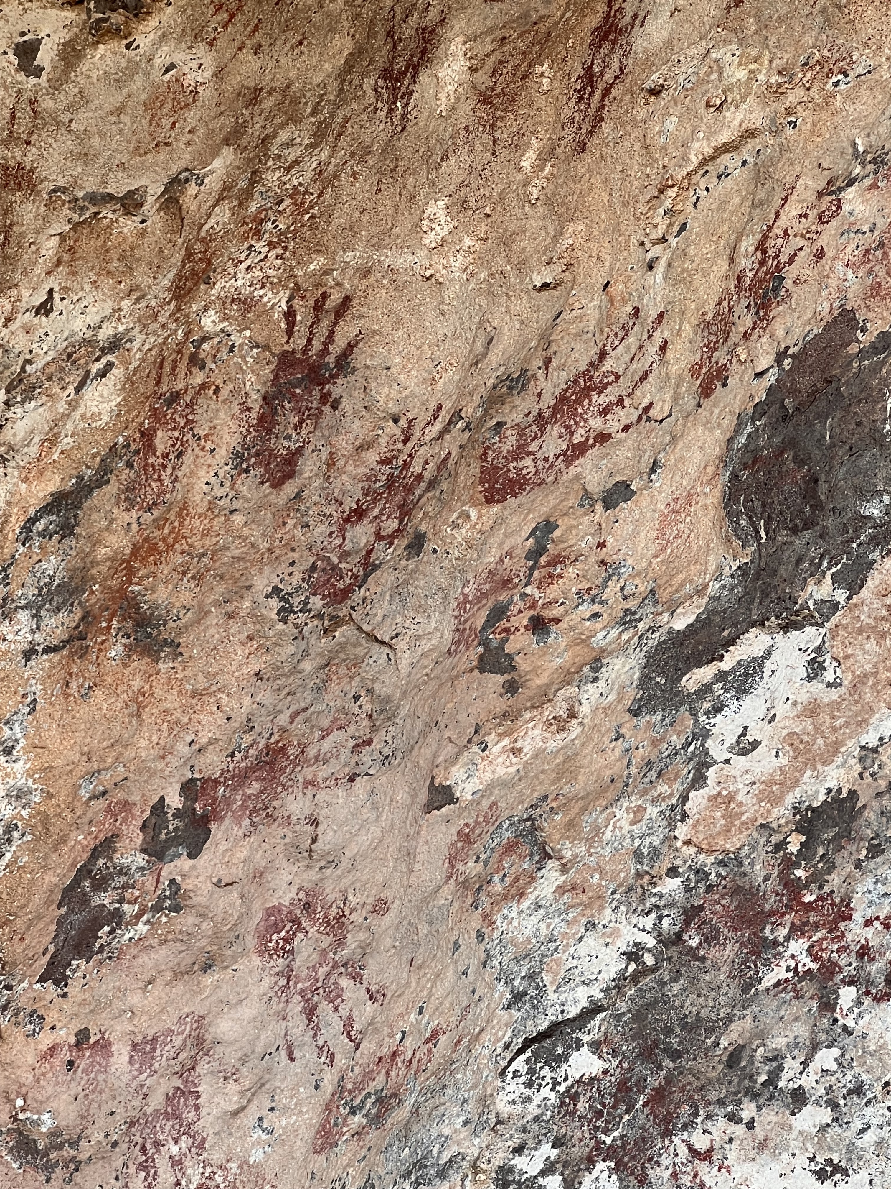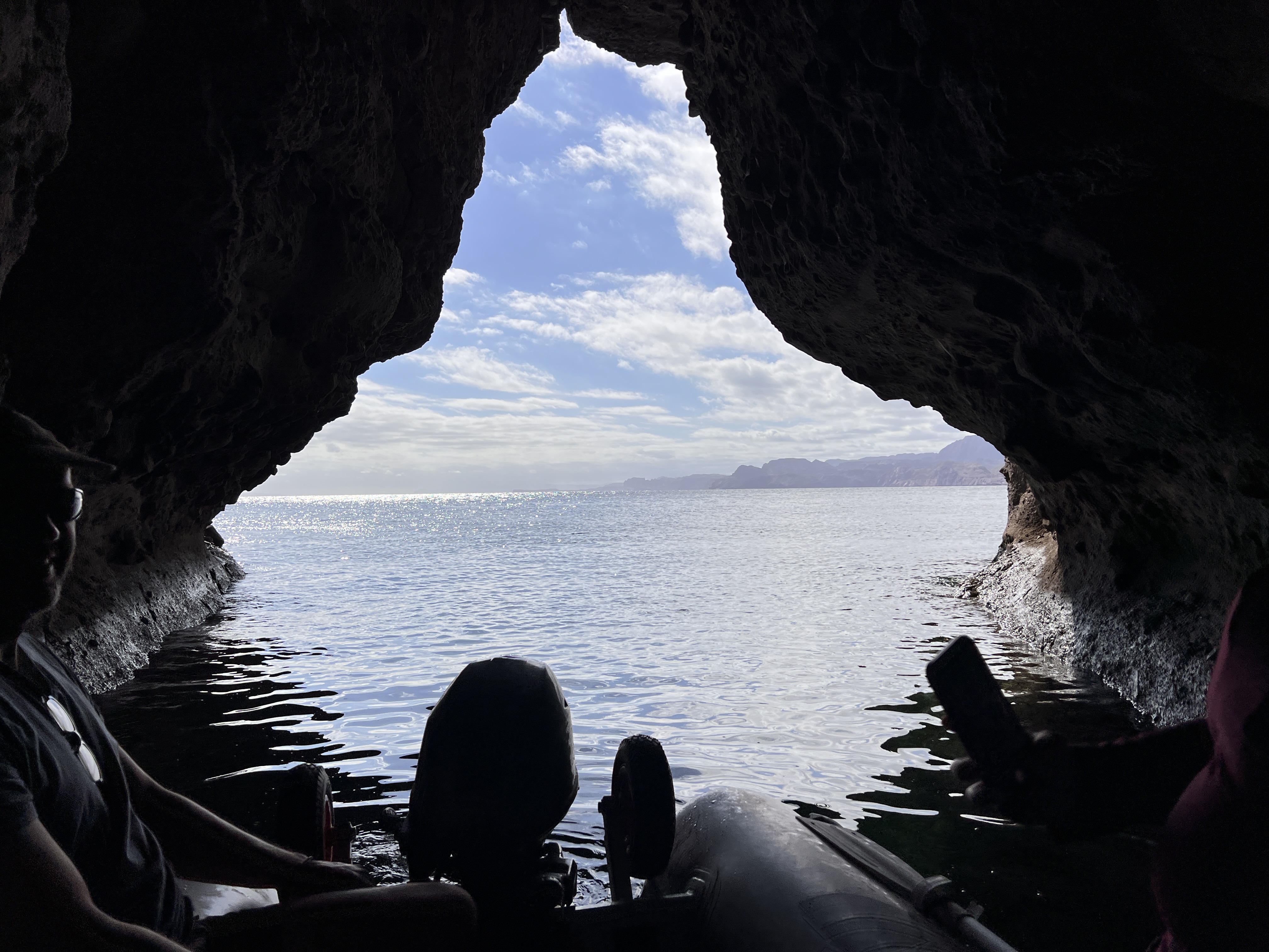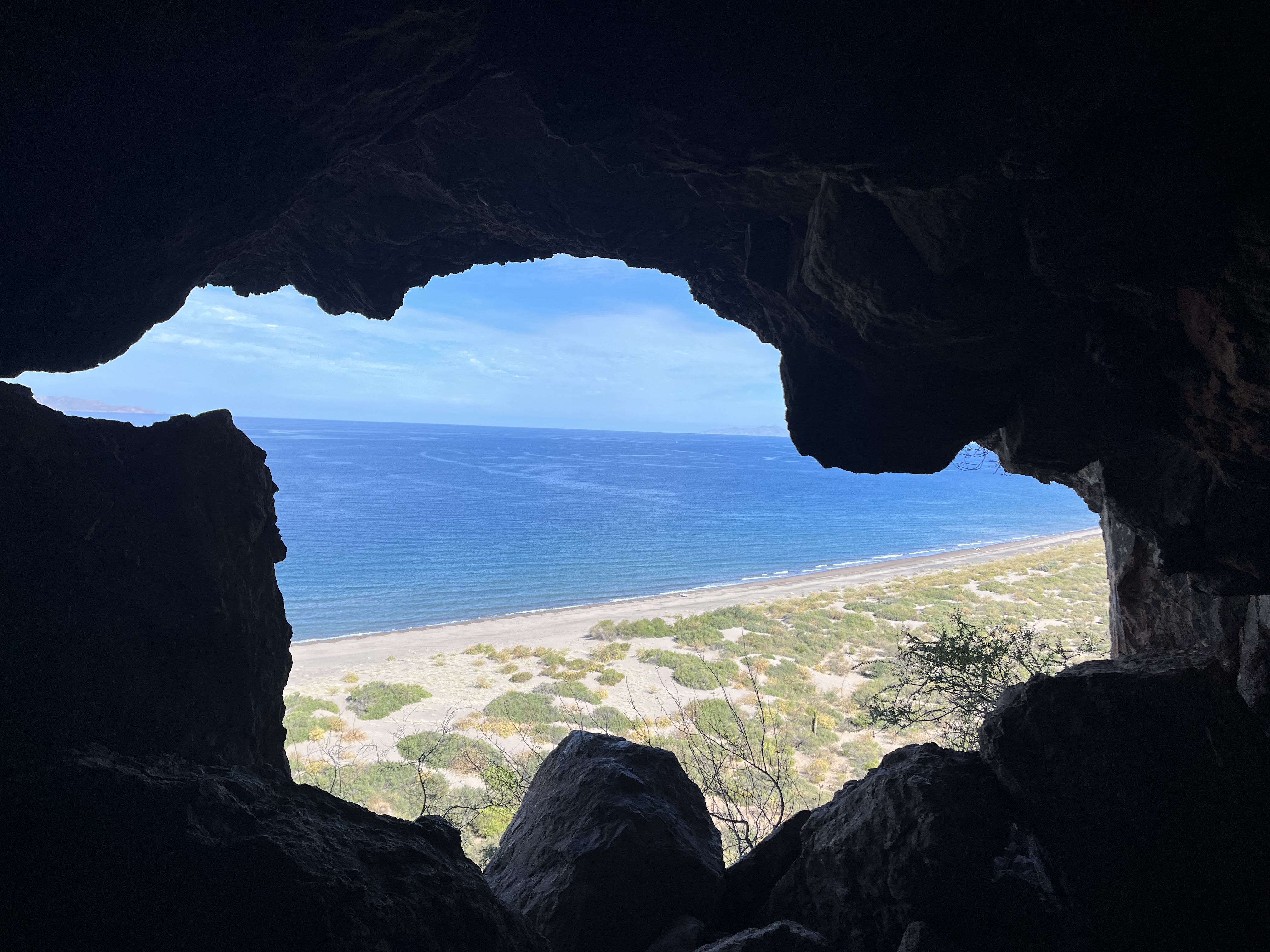 Reaching the mouth of the cave required some scrabbling over areas where a fall could be catastrophic, so we approached with great care. The cave mouth provided a glorious view of the Sea of Cortez in front of us. The mouth divided into two separate entrances into the shallow cave behind, and in the center was a space covered with red handprints. Grace really enjoyed this archeological visit, and scoured the cave to see if she could find any stone tool remnants.