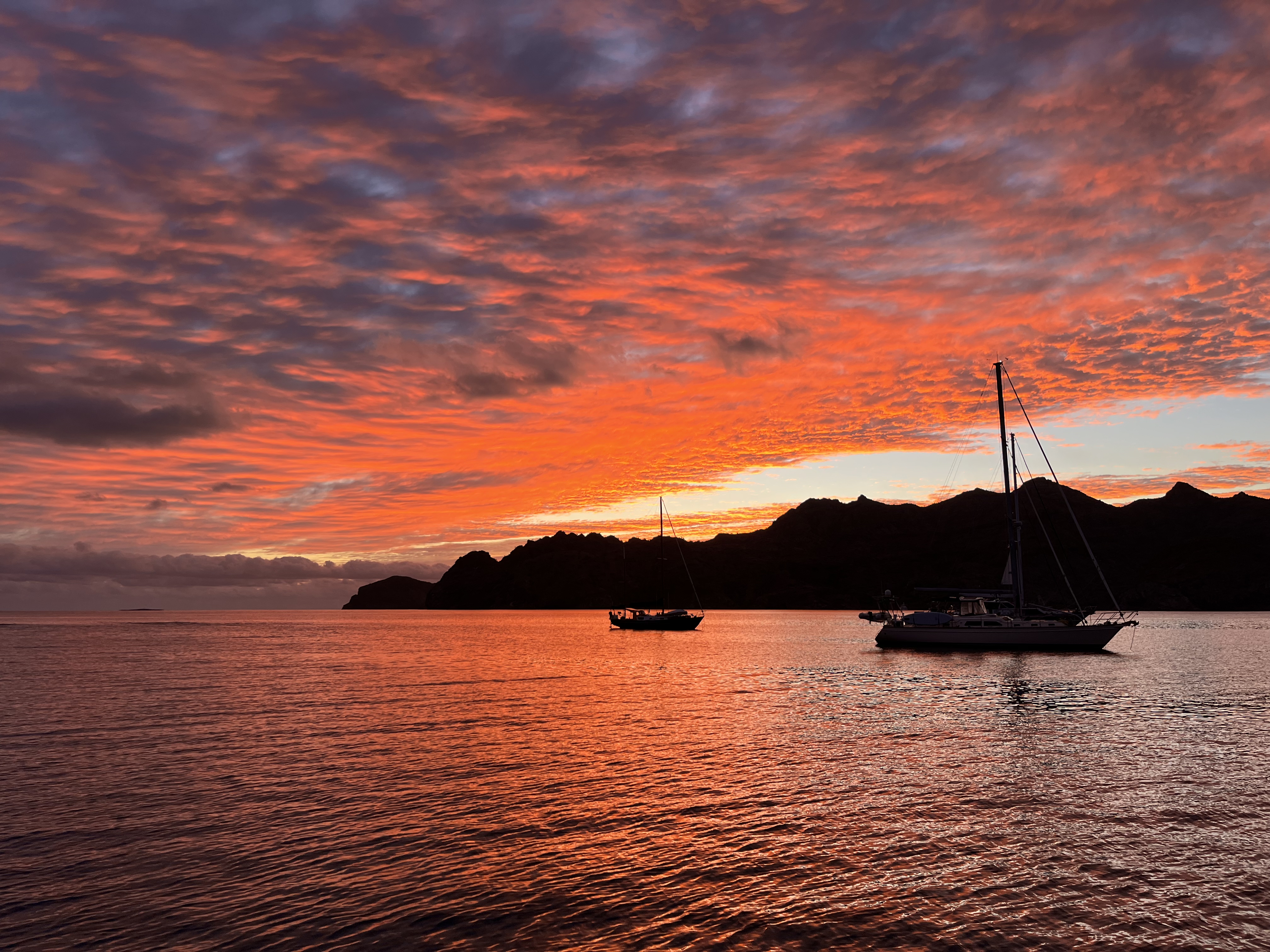 As we neared the anchorage, we traded messages with Okisollo, who had arrived there a couple days ahead of us. They let us know that a spot had opened up between them and the shore, the prime spot to be out of the northern swell. We cruised in past them and dropped our hook in 20′ of water over sand, with the shore just out of range of our anchor scope. I wouldn’t have had the chutzpah to take that spot without Okisollo having blessed it before hand!