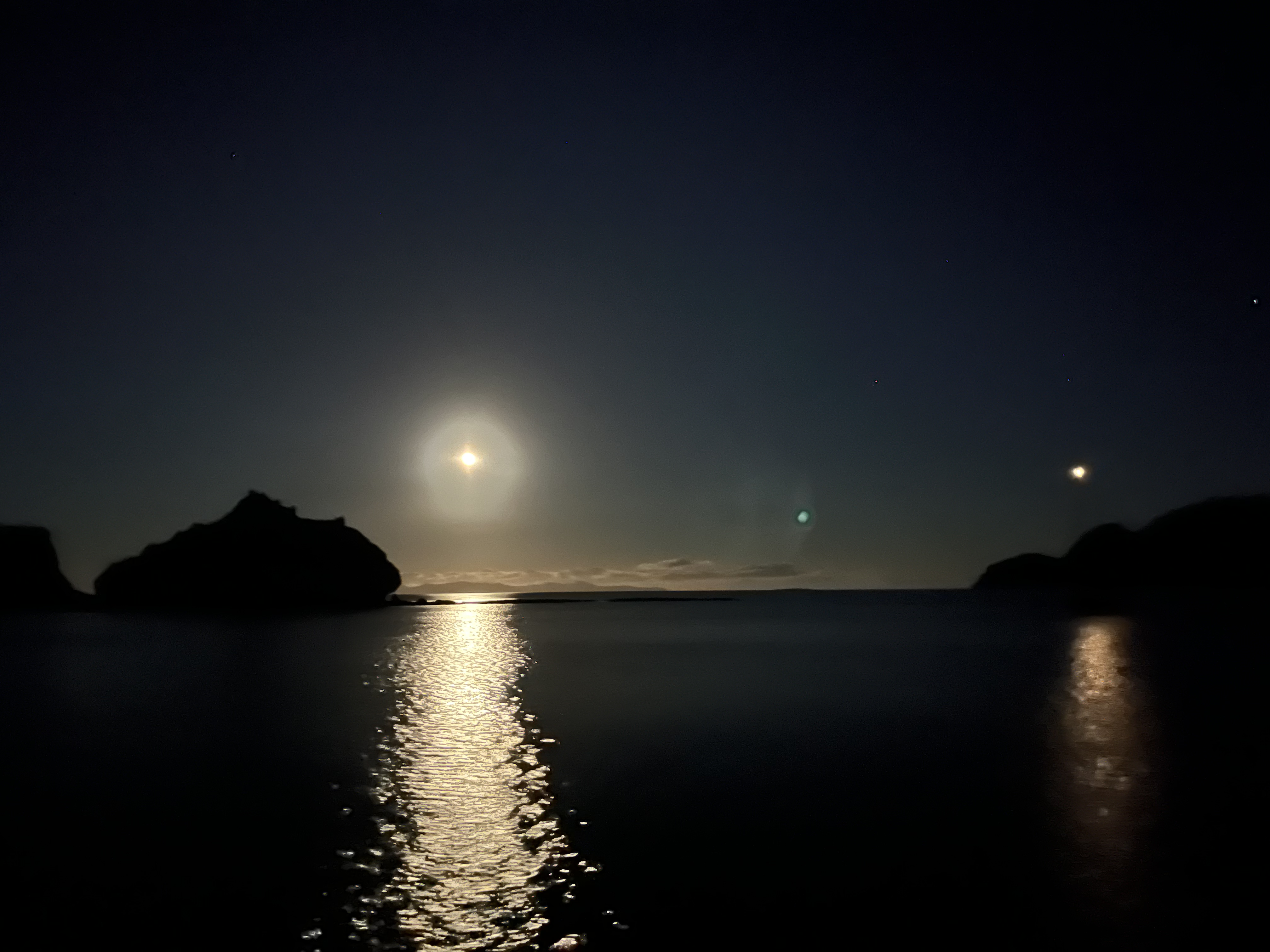As night fell, the winds began to pick up even in our sheltered bay. While we were sure the winds out in the open water were northerly, the winds in the bay whistled in from the east, down the canyon at its head, and blasted across the surface of the water. At its worst the wind was very cyclic in nature, hitting the boat in a large gusts of more than 25 knots before slowly settling down to almost complete calm. I could see the line in the water moving towards us in the bay as each gust approached, like an invisible hand scooping across the surface of the water.