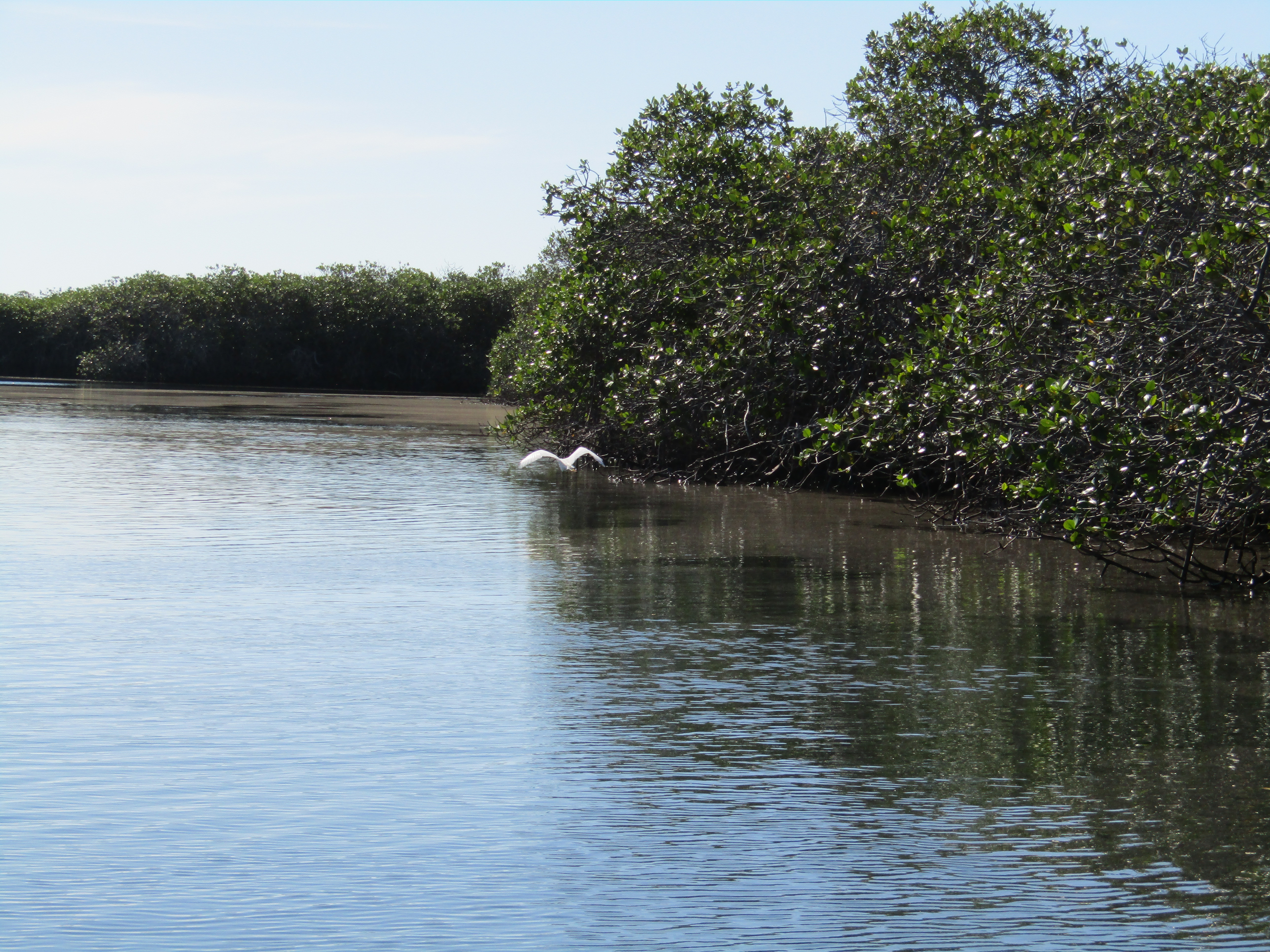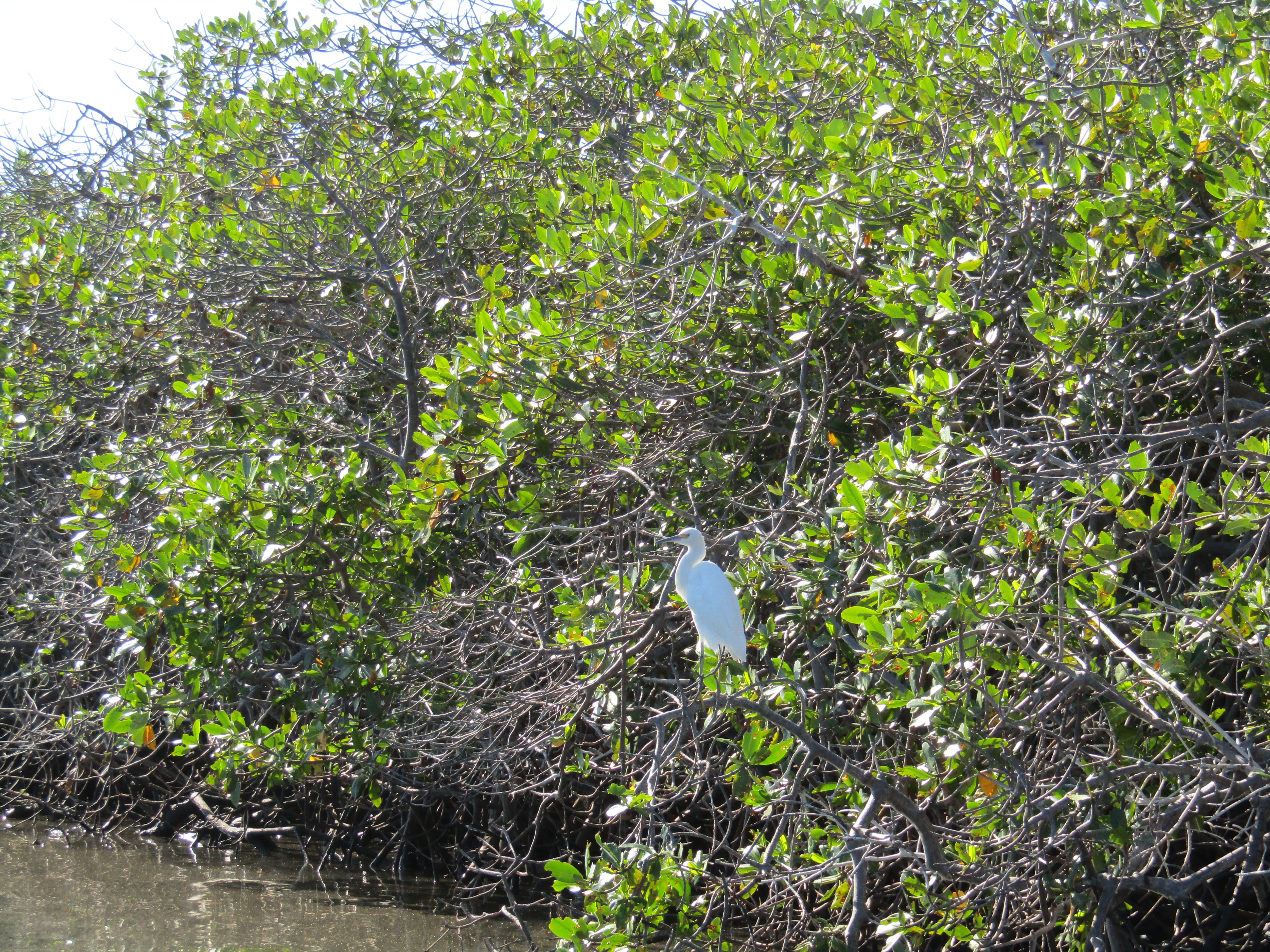 The mangroves were a different world of calm greenery. We idled through the narrow channel beyond the entrance, coming upon several great egrets perching on the mangroves above the water. Many of these birds were quite unbothered by our presence, never flying even though we passed by just feet away.