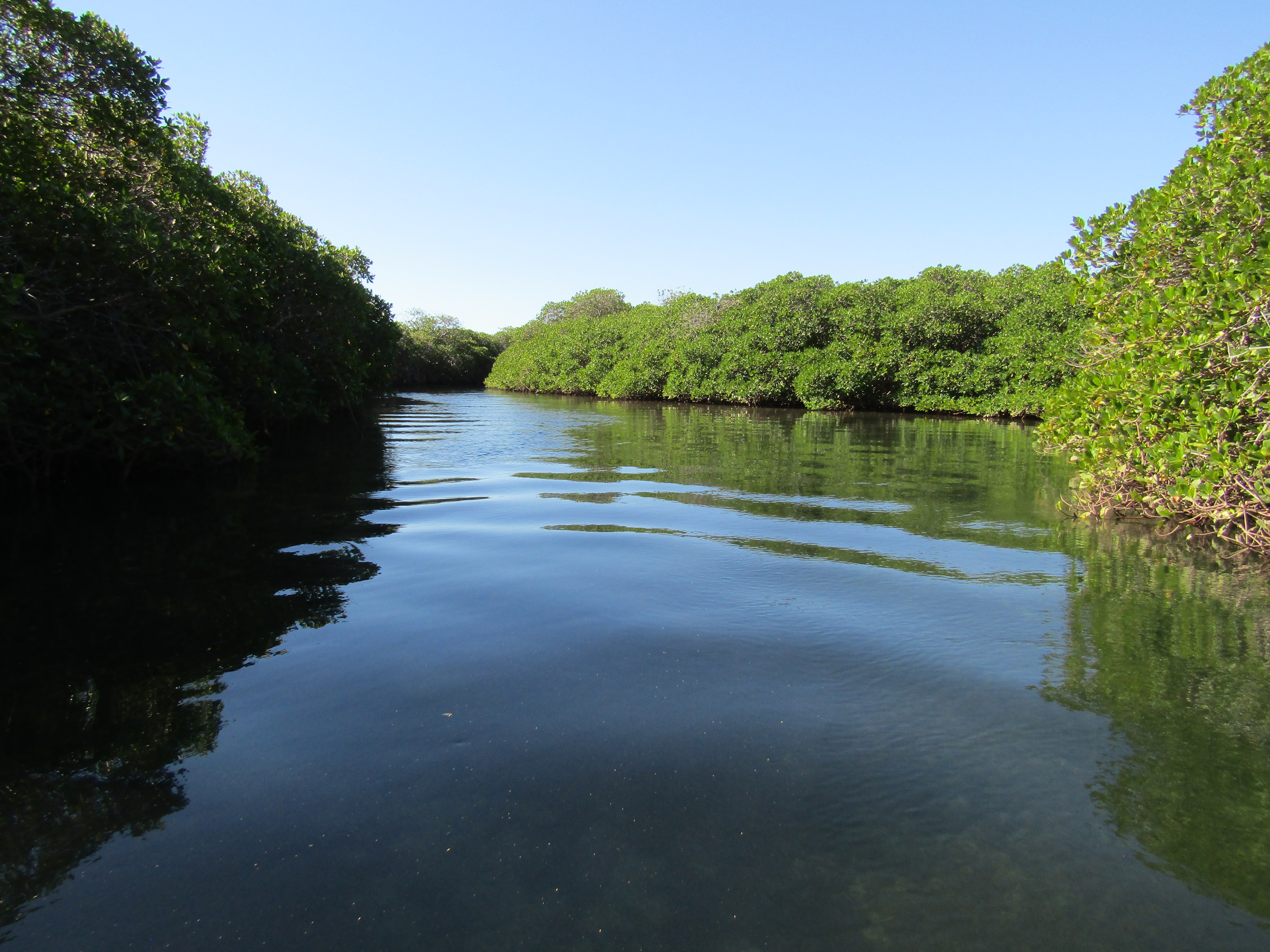 We spent about 20 minutes up in the mangroves, watching the birds and tooling through the greenery-lined waterways. We even scared up a turtle under the water and laughed at our own startlement as he zipped under the boat and into the shadows. Turning the boat around we were wiser about the deep parts of the lagoon entrance, and made it out through the chop without swamping.