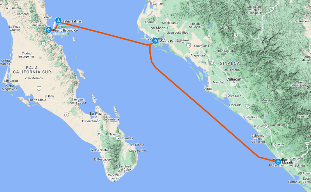 On Monday we started our journey away from Puerto Escondido and across the Sea of Cortez. We had been in Puerto Escondido for ten days, and I was starting to feel the need to move on. Around Thanksgiving we had decided that we would go home to Boise for Christmas, and we now had plane tickets out of Mazatlan that were driving our schedule forward. We had also decided that we would take a train ride on “El Chepe” through the Copper Canyon, and had tickets for the next weekend to do that. Time was pressing on us, a dangerous thing for sailors.