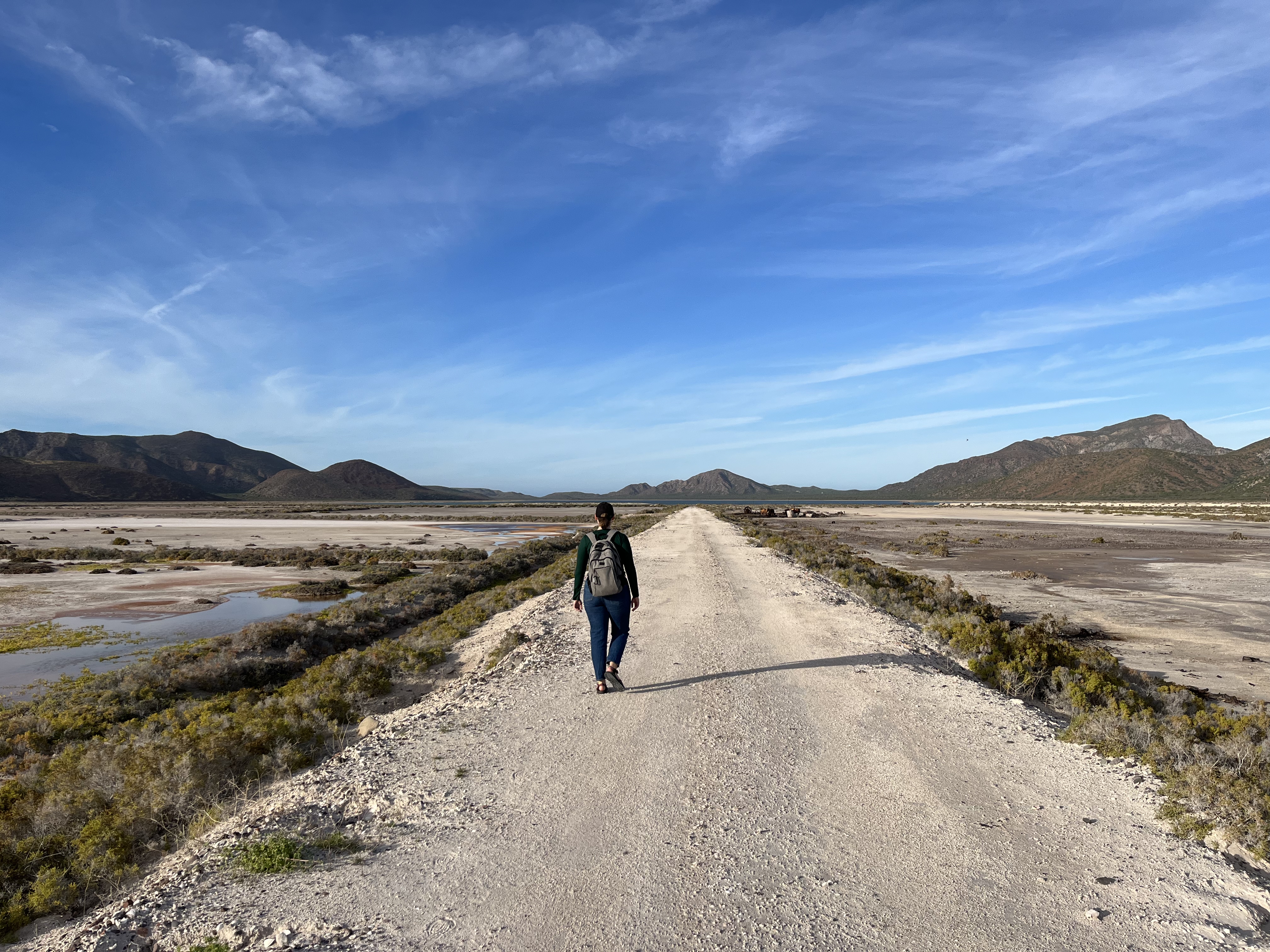 There was no one obviously present at the hunting lodge, and we really didn’t want to poke around in the buildings where people might still be living. We viewed the front of the chapel and walked around the hunting lodge to get to a road leading back to the lagoon. The road was very flat, crunchy, and salt crusted. It seemed a blasted soil, and it was odd to see that salt-tolerant brush could still grow here. We crunched onward towards the lake, but unfortunately could not locate any of the salt pillars.