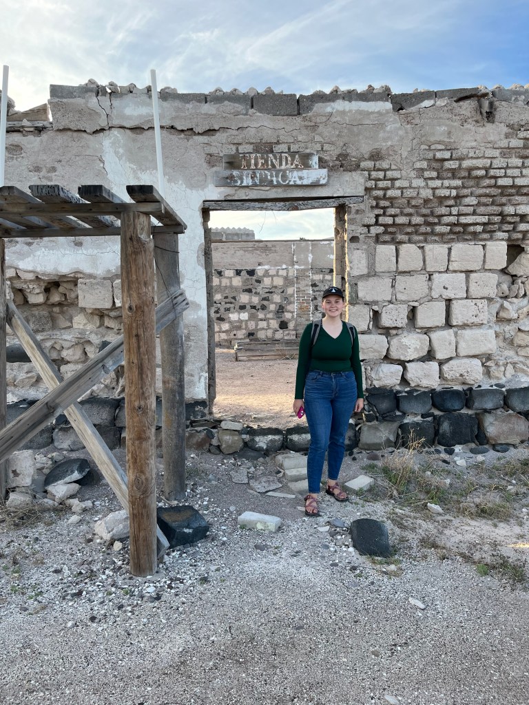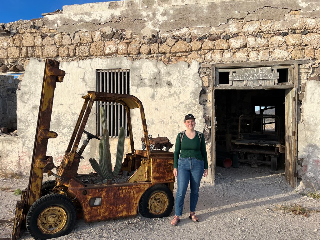We walked around the edge of the lake for a bit, examining the oddly hard and salted earth. We made our way back to the deserted facility and poked our noses into some of the buildings there. It appeared to have been a relatively well staffed settlement with a commissary and medical facility for the workers. The building ceilings had all collapsed, leaving just the skeletons of walls behind. We enjoyed seeing the two rusted forklifts, each with its own cactus growing in the driver’s seat.