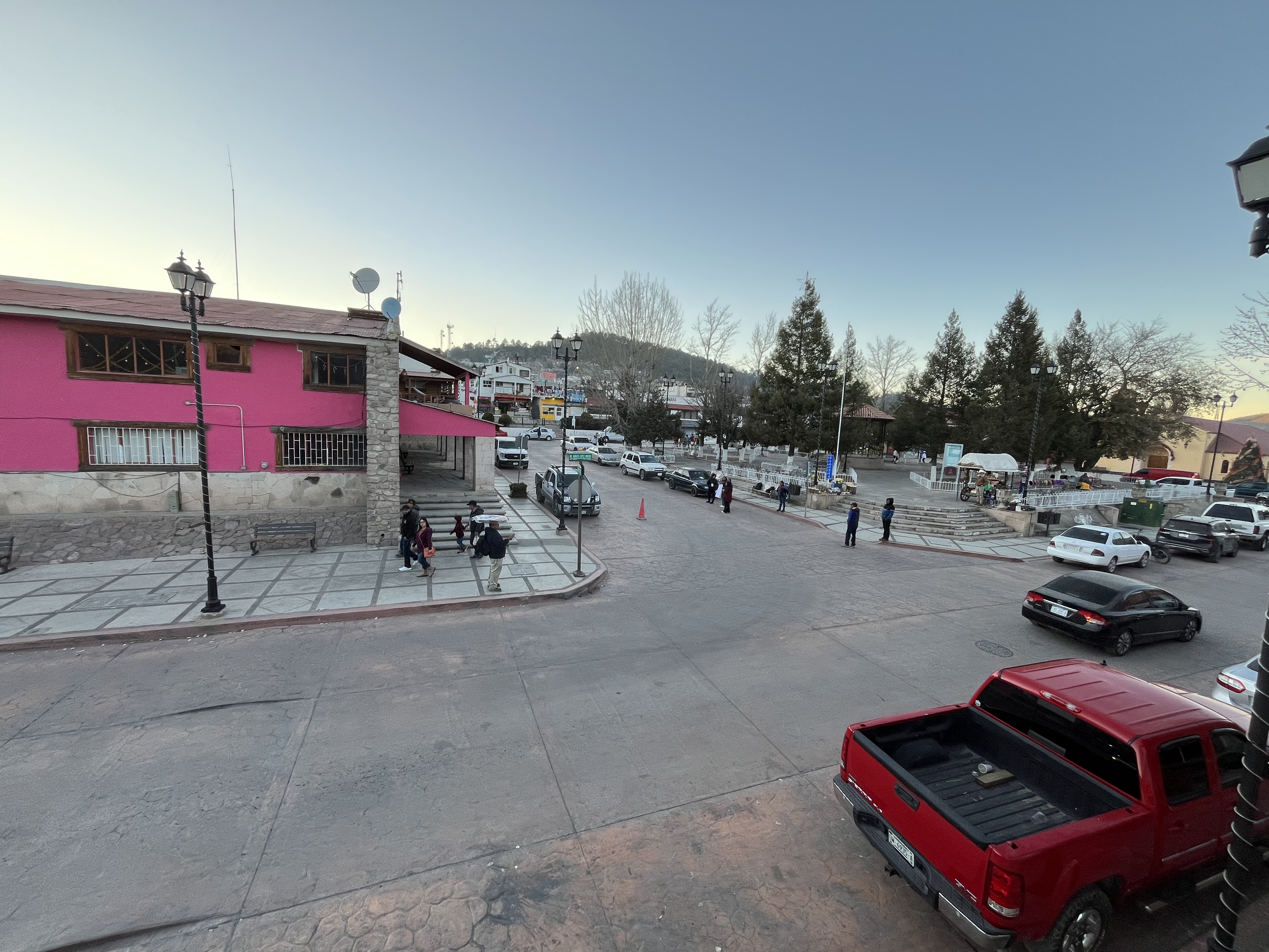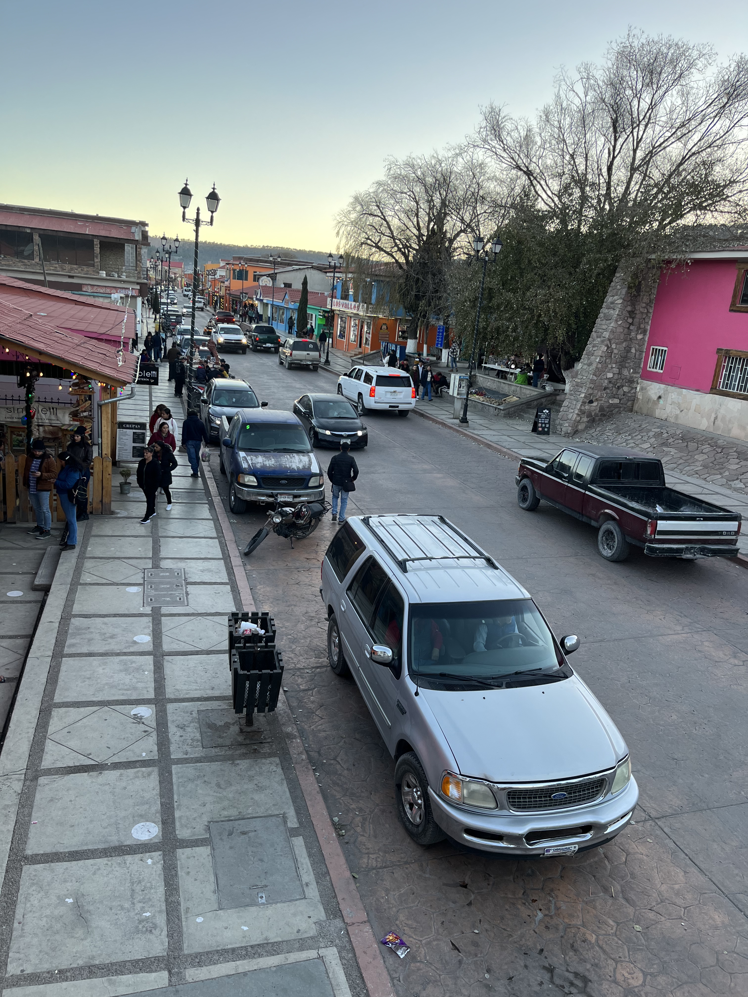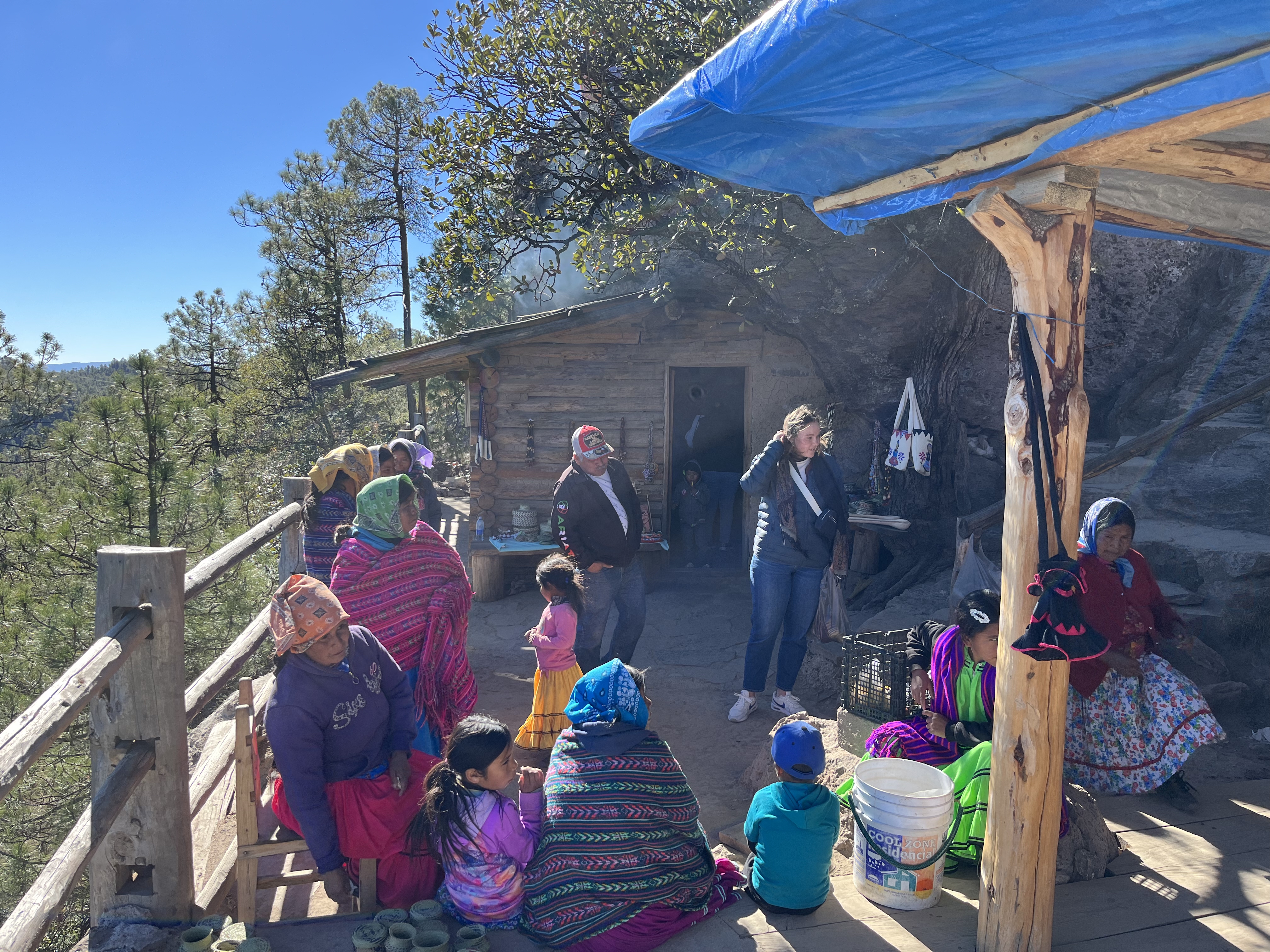 After riding for about 9 hours to Creel, Chihuahua, we disembarked to spend the night in Creel. Creel is a former logging town of about 5,000 people largely inhabited by the Rarámuri or Tarahumara people. This group of Indigenous people of the Americas are renowned for their long-distance running ability. We stayed the night and the next day arranged a guide/driver to take us back to the Divisidero (Continental Divide) where we could access the Copper Canyon. The drive was about 45 minutes, and along the way our driver stopped to show us another divide. The often reclusive Tarahumara people were having a reunion in the area and hundreds of people were gathered about in small family units awaiting the festivities. I had hoped we would see some kids along the way and had brought a sack of fun-sized candy bars from the US for the occasion. We handed out candy and decks of playing cards to the families we encountered. They politely accepted our small gifts.