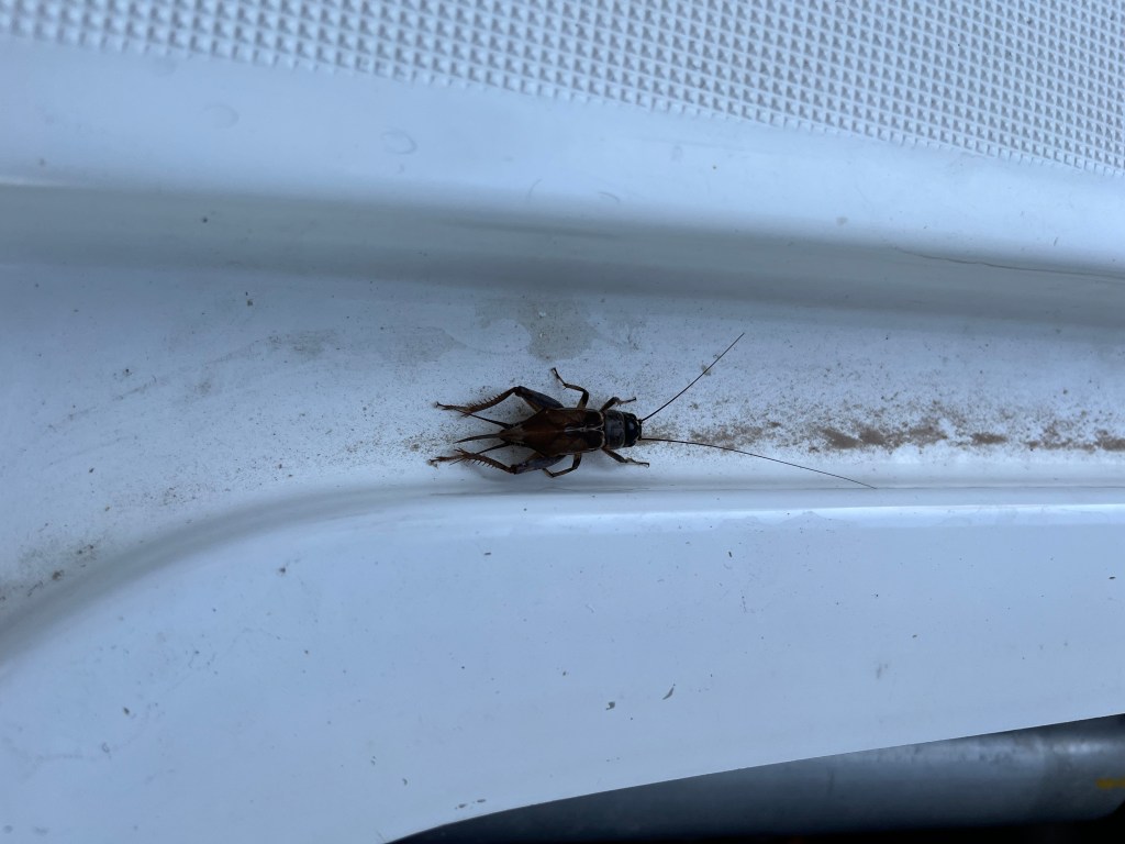 In the early morning hours my shift started. I had been hearing a new squeaking sound coming from somewhere at the back of the boat, and it was driving me nuts. I really don’t like new noises, as my worrisome mind immediately thinks it is indicating some imminent mechanical failure. I walked about with my head cocked, trying to pinpoint its location. My only clue as to its source was that when I stood on the starboard engine compartment, I didn’t seem to ever hear it. Eventually I opened the hatch to the engine compartment to look inside, and found that a hitchhiker had been the source of my squeak! From then on I enjoyed hearing my little cricket friend as he called out from his hiding place.