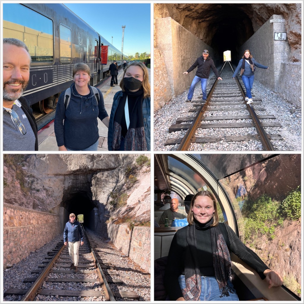 On Friday morning, we boarded El Chepe at it’s Pacific terminus in Los Mochis for our weekend excursion. From Wikipedia, “The El Chepe train crosses the Sierra Madre Occidental, part of the range that in the United States is called the Rocky Mountains. There is no road covering the trajectory. It runs 673 km (418 mi), traversing the Copper Canyon, a rugged series of canyons that have led some to call this the most scenic railroad trip on the continent. It is both an important transportation system for locals and a draw for tourists. The tracks pass over 37 bridges and through 86 tunnels, rising as high as 2,400 m (7,900 ft) above sea level near Divisadero (the continental divide), a popular lookout spot over the canyons.”