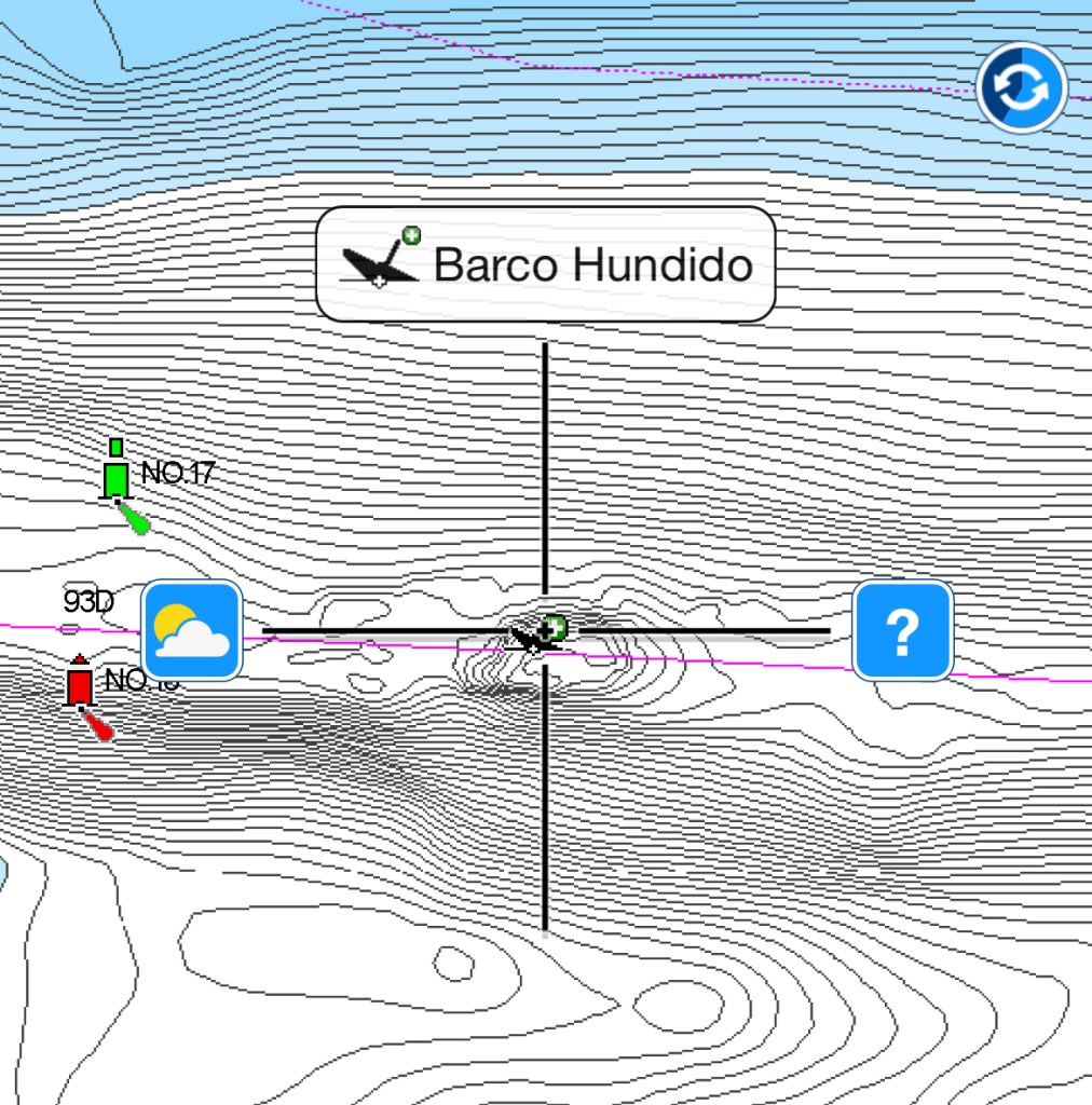 As we approached, I could clearly see the channel markers that were indicated on the charts. The red and green Aids to Navigation (ATONs) were flashing their colors regularly. Since they seemed to line up with the charts, we proceeded to enter in darkness. It was good to note that since there is a refinery offloading point in the harbor, the channel was very well marked. This made coming in at night a breeze for the most part. The only disconcerting part of the entry was the indication of a submerged wreck of the “Barco Hundido” with a “0 feet sounding” right in in the middle of the channel. Presumably this meant you could hit the thing – we never found out, skirting around the spot entirely.