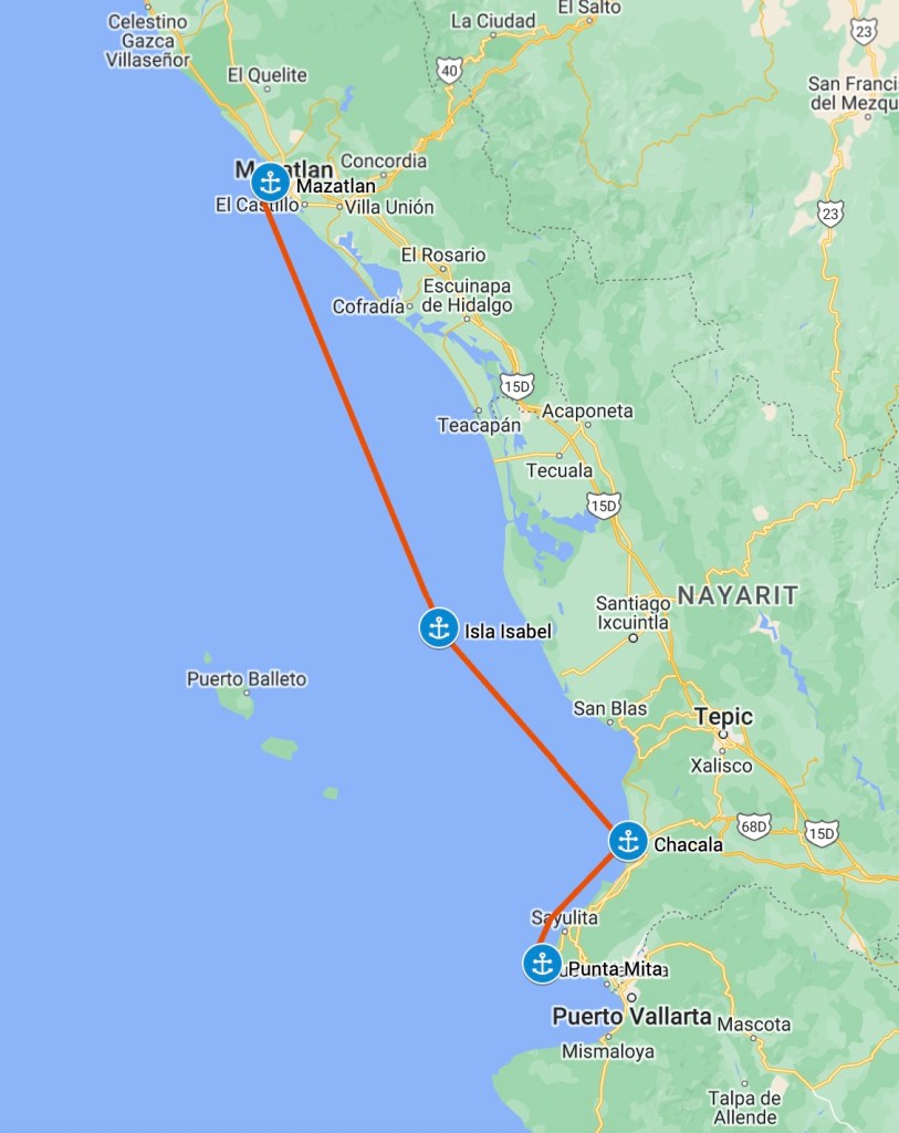 As the final days of our stay rolled by the whole crew was itching to be on the move, and the weather was firming up for a comfortable passage south. It was about 90 nautical miles from Mazatlán to Isla Isabel – more distance than we could cover in a single day between dawn and sunset. So we planned for an overnight that would get us out of the marina in daylight Saturday evening and have us arriving at the island comfortably after sunrise Sunday morning.