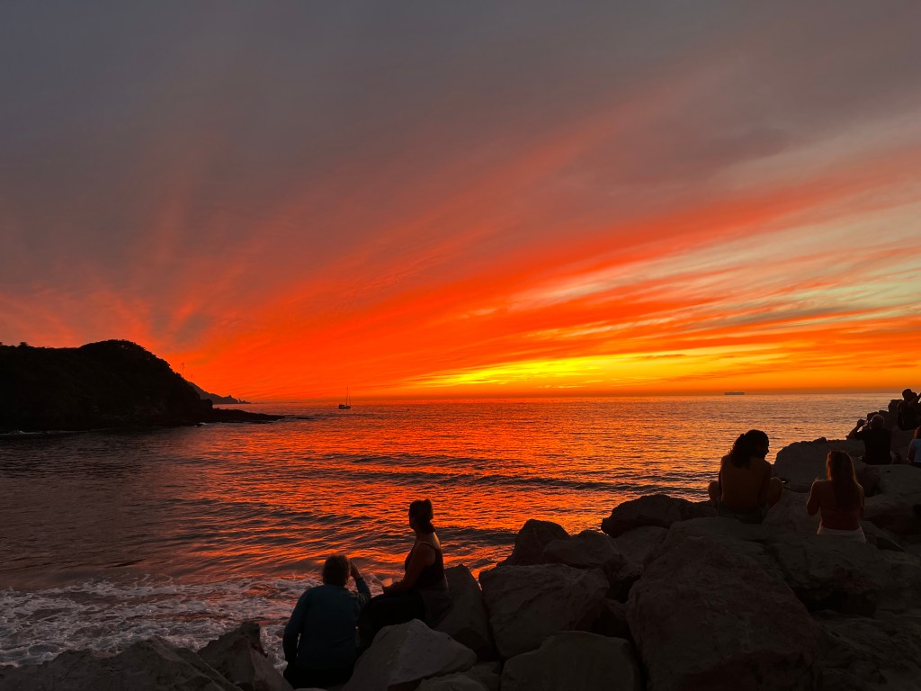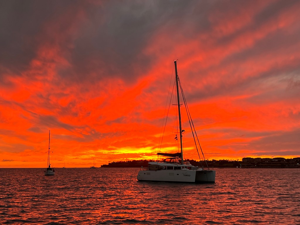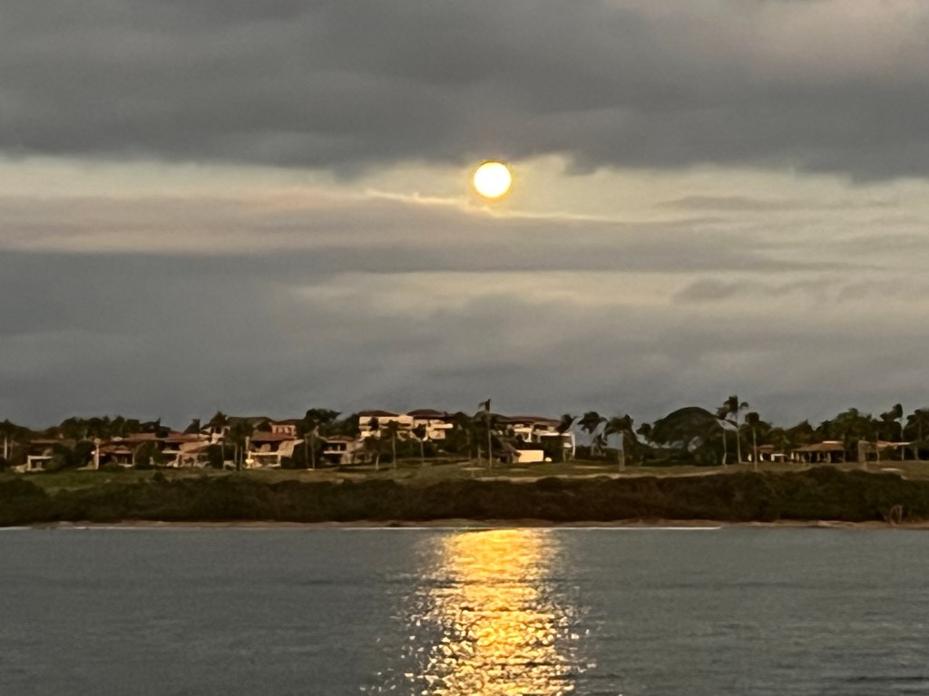 We anchored in the wide open bay south of Punta Mita, joining tens of other boats anchored there. The bay offered a huge area for anchoring in 20-30 feet over sand, so we picked an open spot and settled in. About an hour later our neighbor catamaran Venus from Chacala pulled in next to us, and we invited them over for what would be a pleasant sundowner watching the sunset onboard Perception.