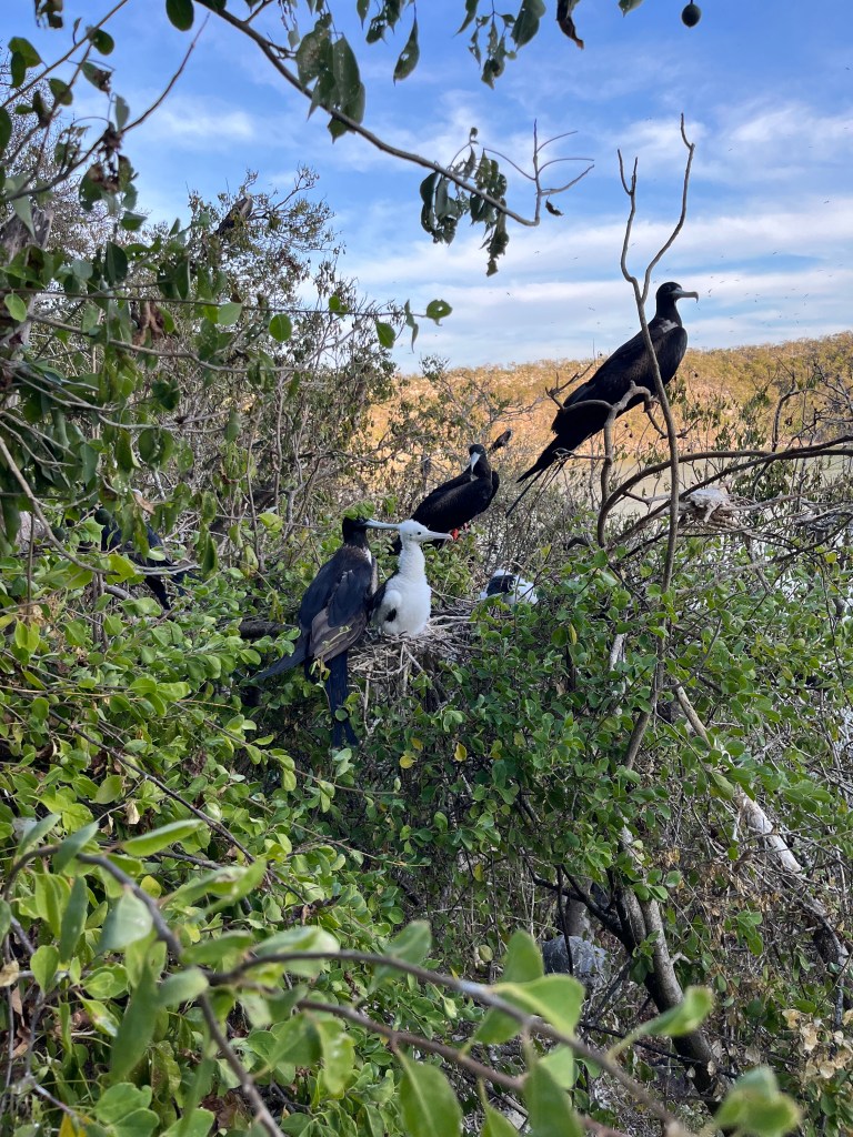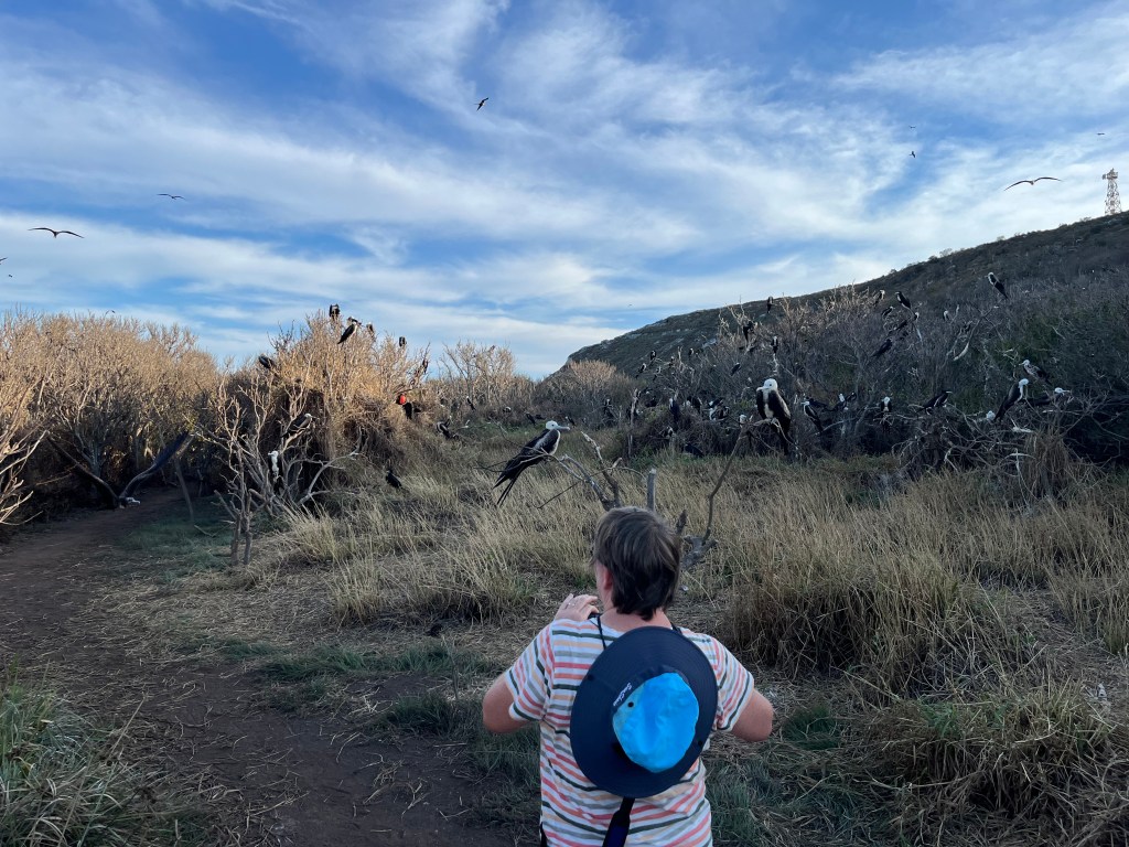 The number of birds on Isla Isabel was absolutely insane. There were frigatebirds in every tree, often just above head height. They didn’t seem at all afraid of people. I was regularly startled if I kept my eyes on the trail too long, looking back up to find one of the sharp-billed birds just a few feet from my face. In the picture below, Melinda has her choice of birds at which to point the camera, including one male with his bright red “gular pouch” inflated.