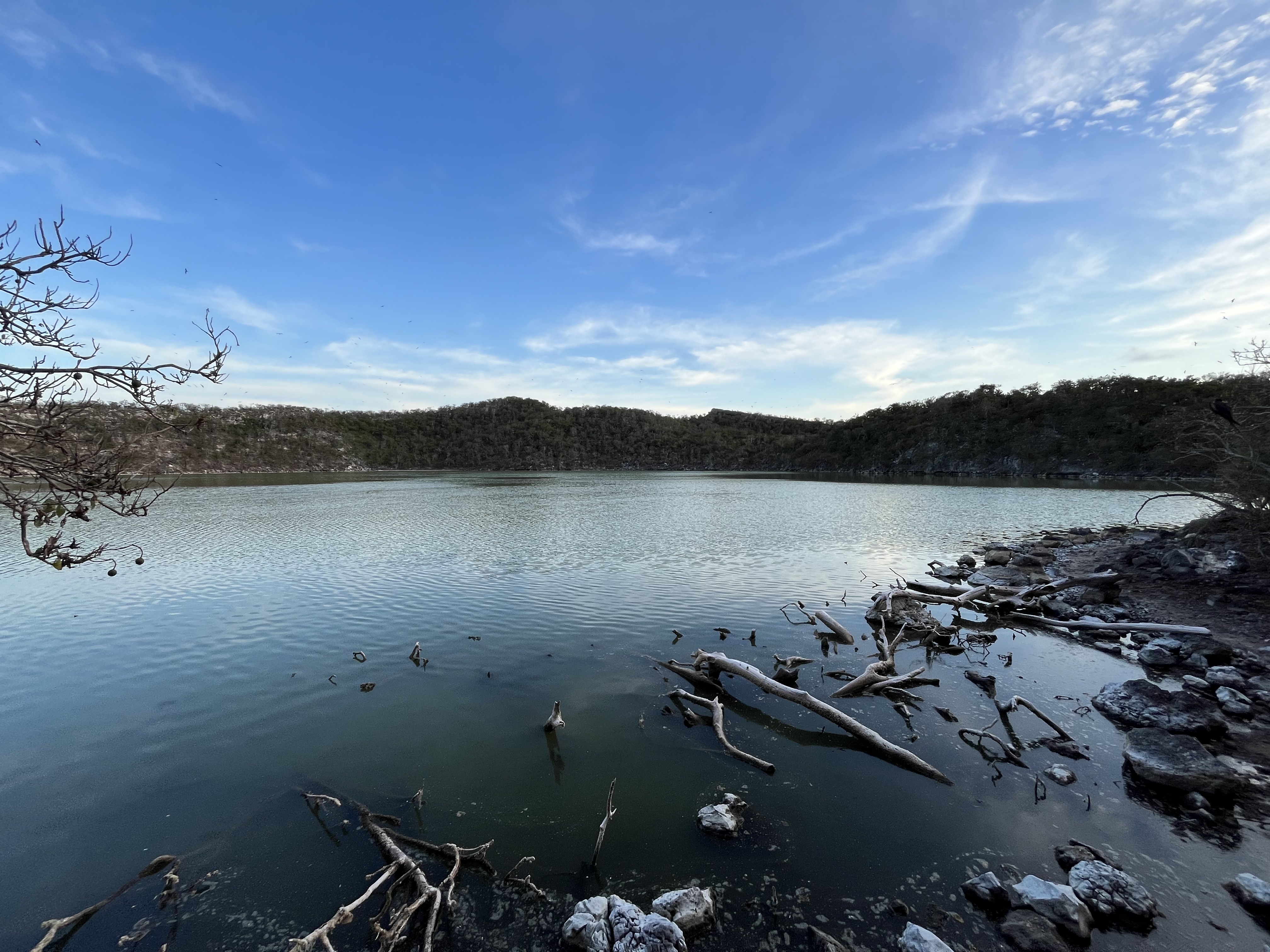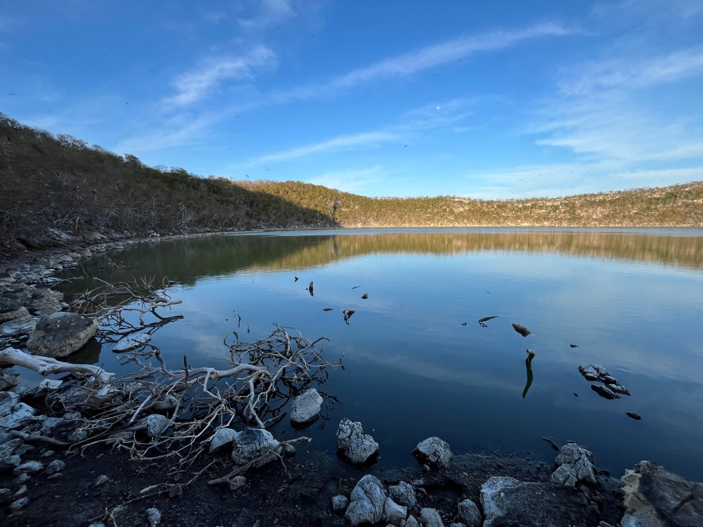 The crater lake, while beautiful, appeared to be quite stagnant. The shore was littered with rotting branches and was the final resting place for a number of frigatebirds. We wondered how a handheld water filter would do sucking from this foul pool.