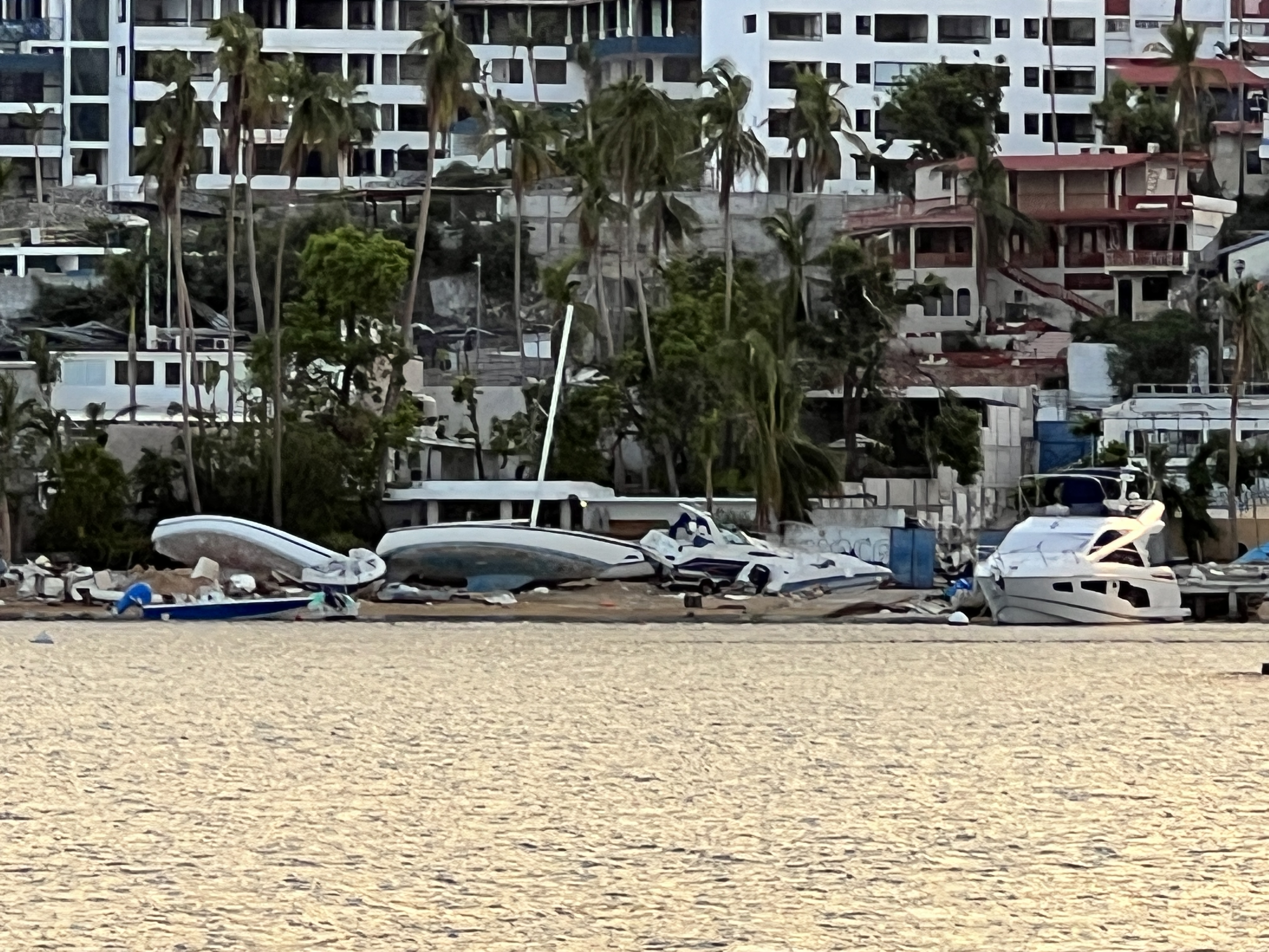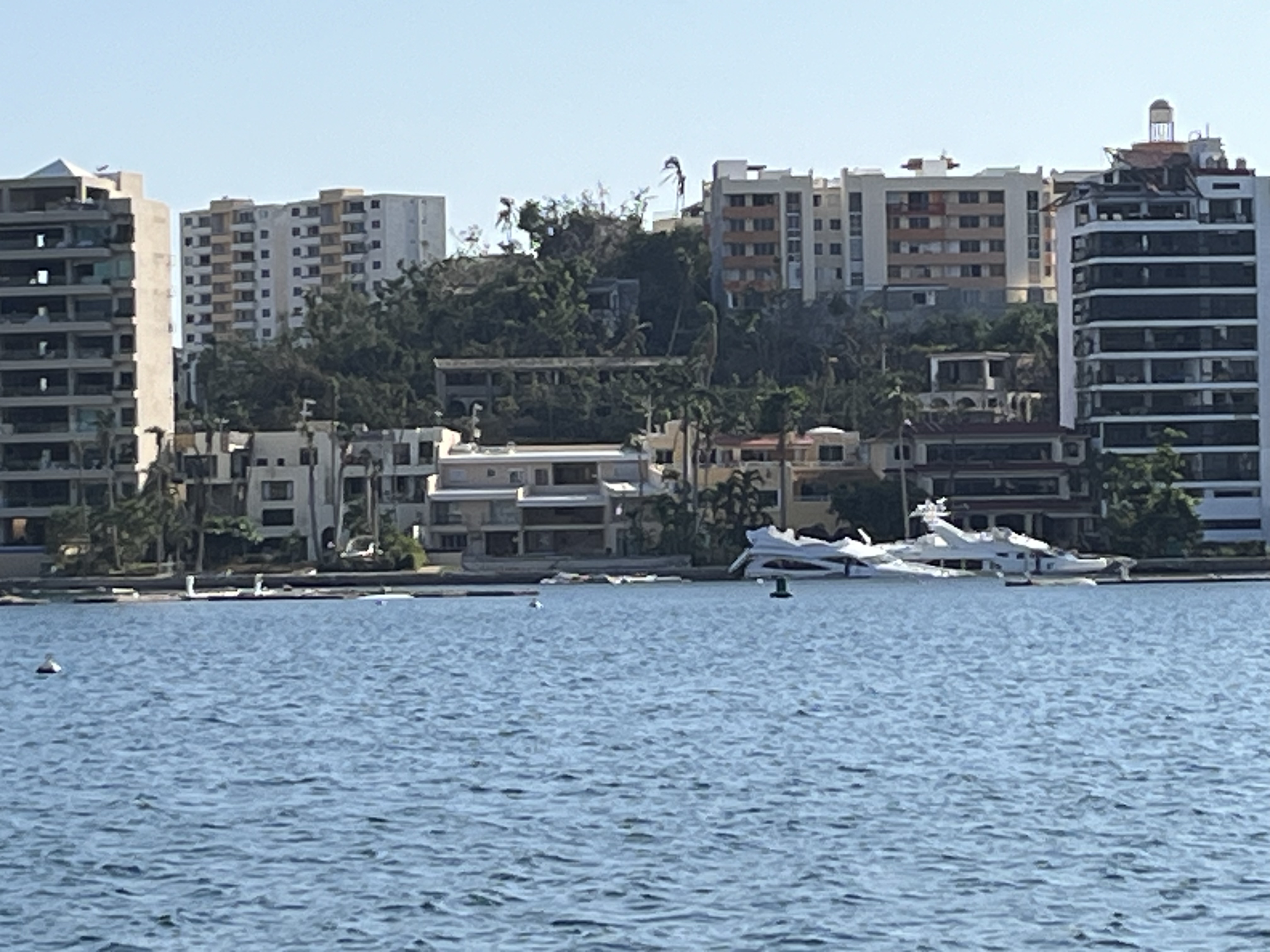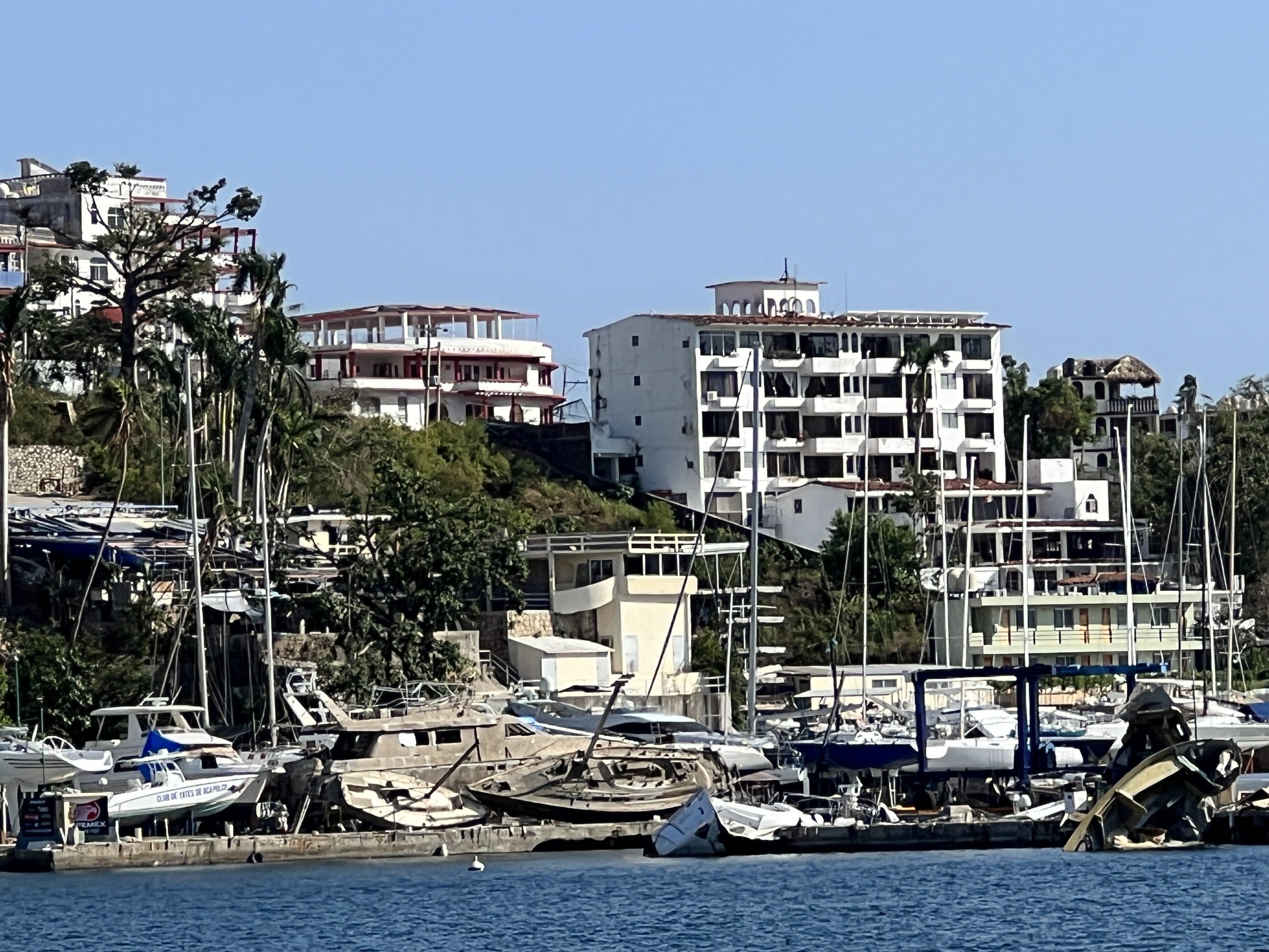 Prior to Otis, I had always planned on stopping in Acapulco on this leg of our trip. The Panama Posse had a great relationship with a local sailor named Vincente, who had a set of moorings and pangas in Acapulco Bay. Vincente’s experience with Otis was tragic. The local community initially thought that the storm would not reach an extreme intensity before passing by the city. Vincente and his family decided to take their boat out of the harbor to ride out the storm. Sadly, Otis rapidly intensified from a Category 1 to Category 5 storm as it approached Acapulco, with sustained winds of 165 mph. The storm slammed into the coast just west of the city and a series of 20 foot waves entered the harbor. Vincente’s boat was lost, and as he had sent his family below while he helmed the boat, his family was lost as well. Vincente was the only one to escape, washing ashore after his boat capsized. At the time of our visit his boat and the remains of his family members had still not been located.