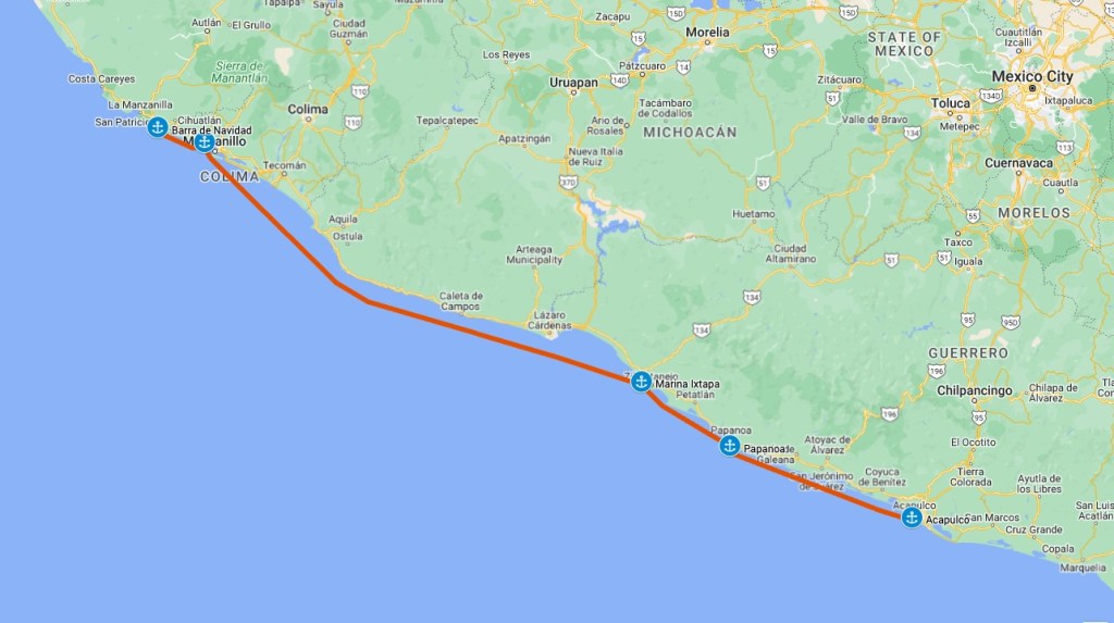 Our next major stop was to be Marina Ixtapa, about 210nm away. Most of the coastline between Barra and Ixtapa offered little in the way of protected anchorages. We were leaving Barra relatively late in the morning since we had to fuel up, and I worried we wouldn’t be able to get into Ixtapa before sunset of the second day. So we made our first day a short hop down to Bahía Santiago just 25 nm away. This would chew off a few hours of the transit and allow us to get a proper early start for our two-day voyage to Ixtapa.