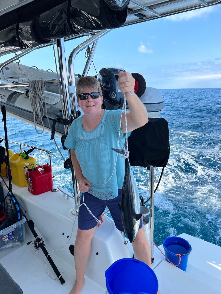We were motoring again in relatively light winds, so Melinda put out our line with our pink squiddy on it to see if we could catch something. We almost hooked a mahi-mahi, something had taken the bait but shortly after Melinda picked up the rod we saw the fish jump and throw the hook. A bit later she got another strike and pulled in a nice little skipjack. Many other fisherman in the Posse seem to think skipjack isn’t worth eating, but we think they are just fine with a dark red meat that goes down well as poké or seared steaks.