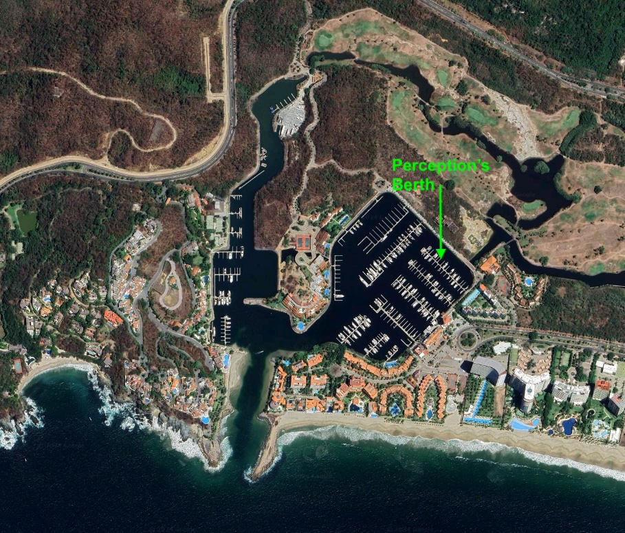 We were making good time down the coast, and by early afternoon we were approaching Ixtapa. Now the fun really began. The marina entrance was subject to fairly significant swell, and you could get breaking waves on your stern as you came in. The channel was also narrow and shallow in places. Timing our entrance and controlling the boat well would be of prime importance.